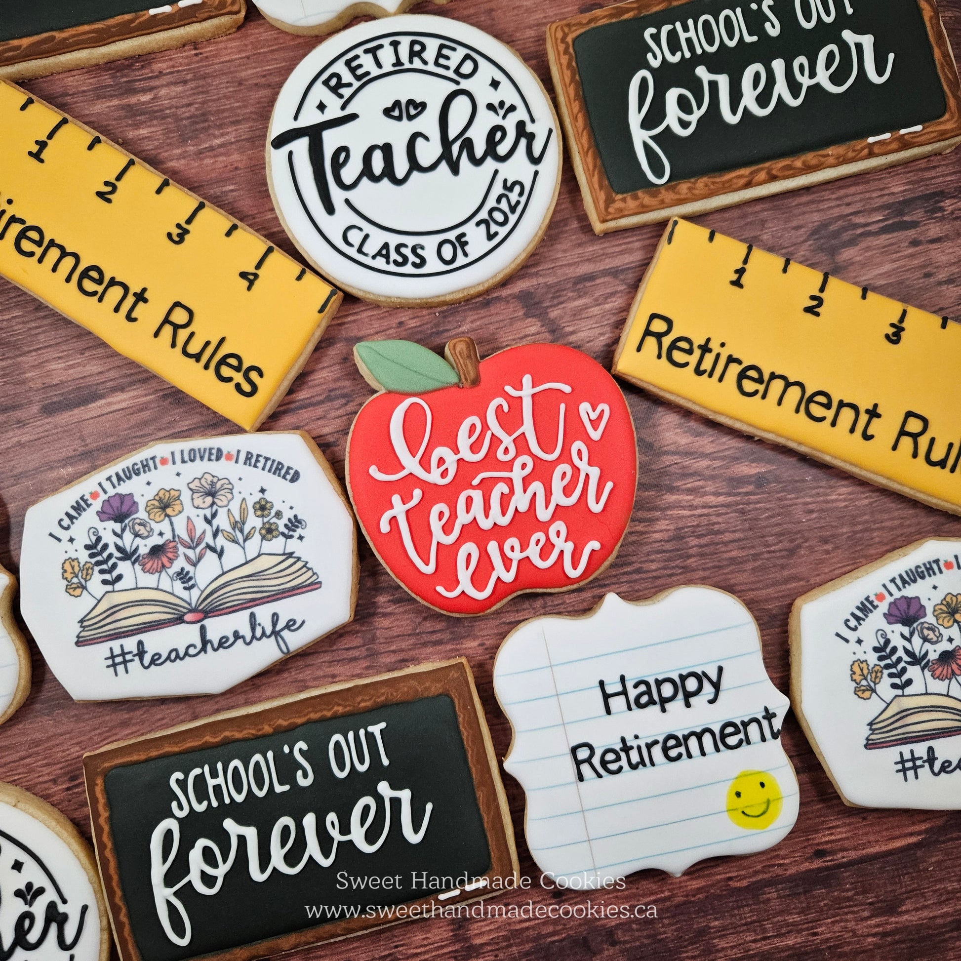 Celebrating the retirement of a much-loved teacher. If you are looking for a consumable gift that your friends and family will be talking about, let's talk options. Pricing starts at $144 for 24 cookies. Availability must be confirmed before placing order. Contact me via email or telephone to discuss design and availability.